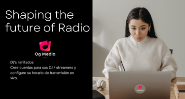 OG Media Radio es una plataforma todo en uno que te permite crear, programar, transmitir y hacer crecer tu estación de radio con facilidad. Tanto si eres principiante como profesional, nuestra plataforma te ofrece la simplicidad que necesitas y la potencia que deseas. Olvídate de las complicadas configuraciones de software de escritorio y administra todo en la nube, en cualquier momento y en cualquier lugar.
